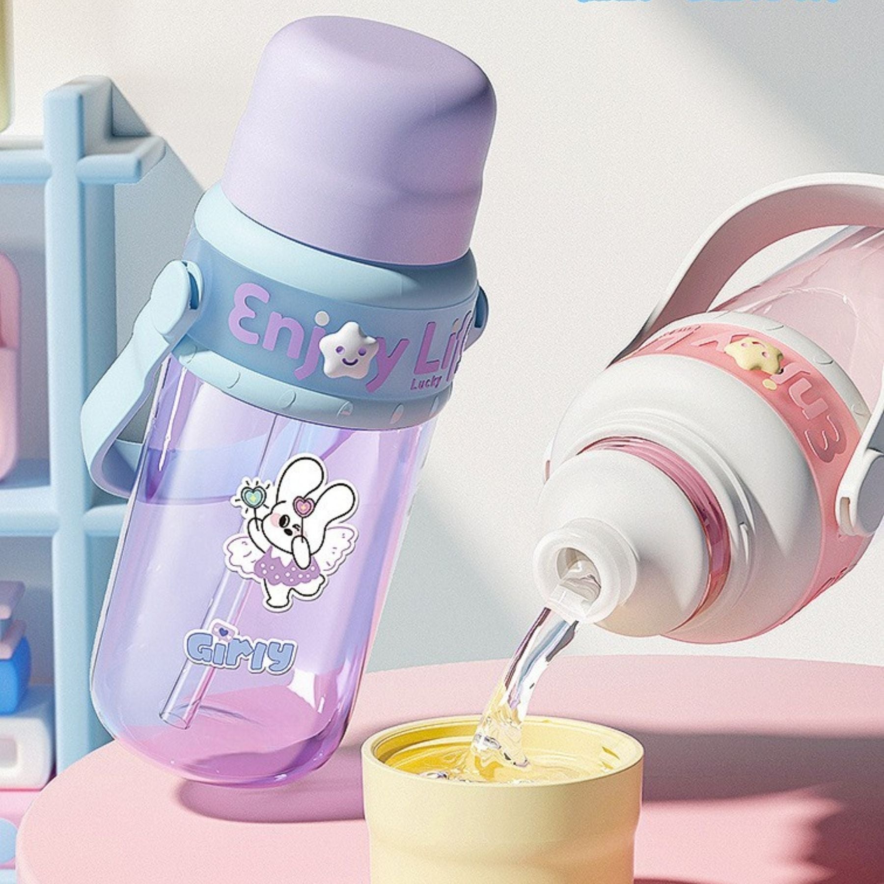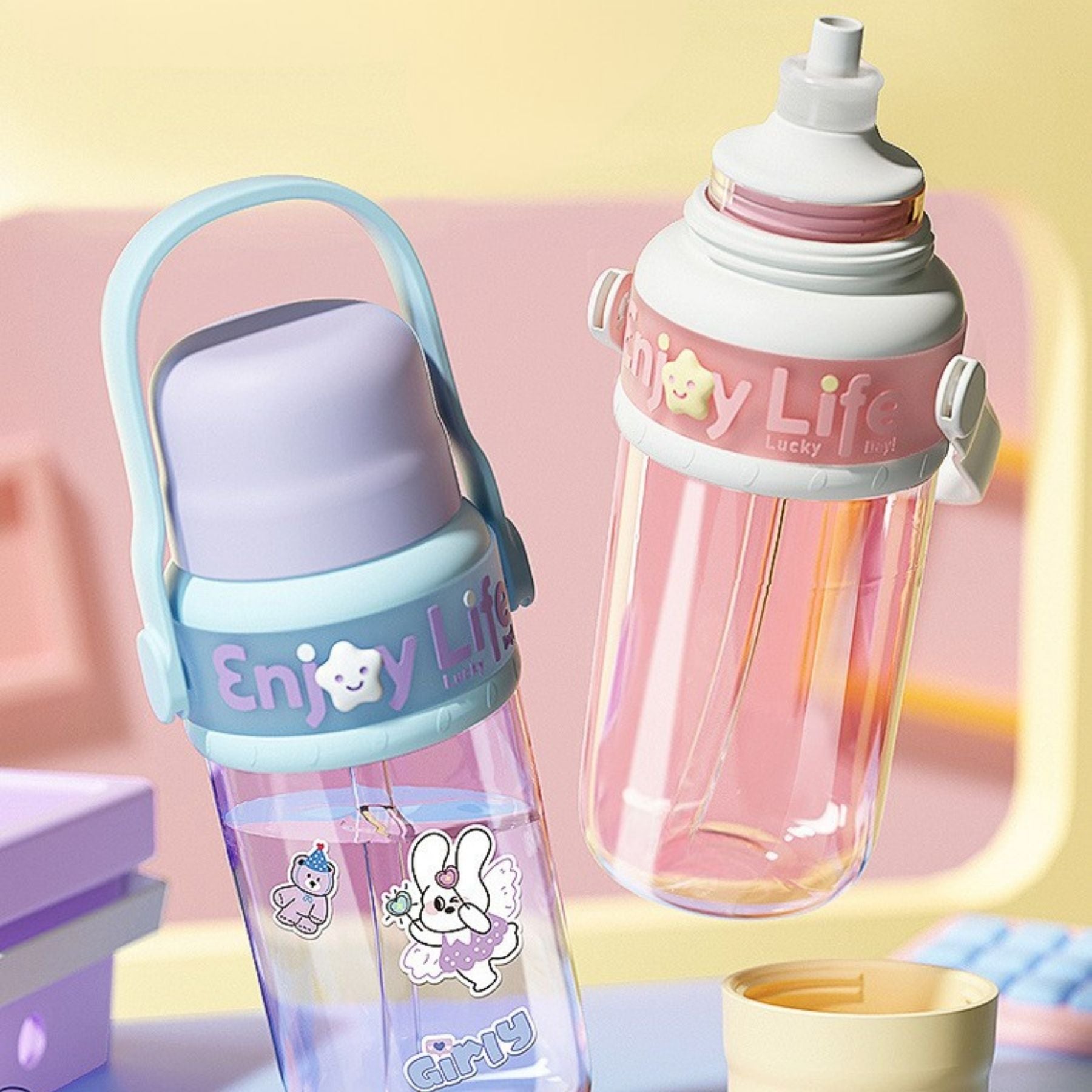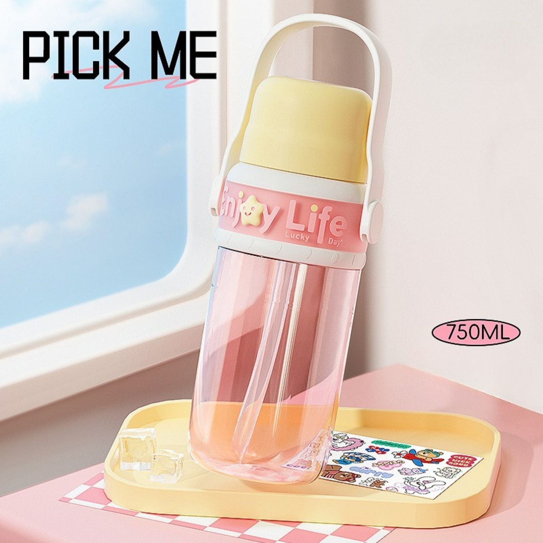 The bottle has a generous capacity of around 750 ml. This is a perfect size for school, gym, or travel. It has a carrying handle. The built-in straw of the bottle helps to prevent spills while sipping.