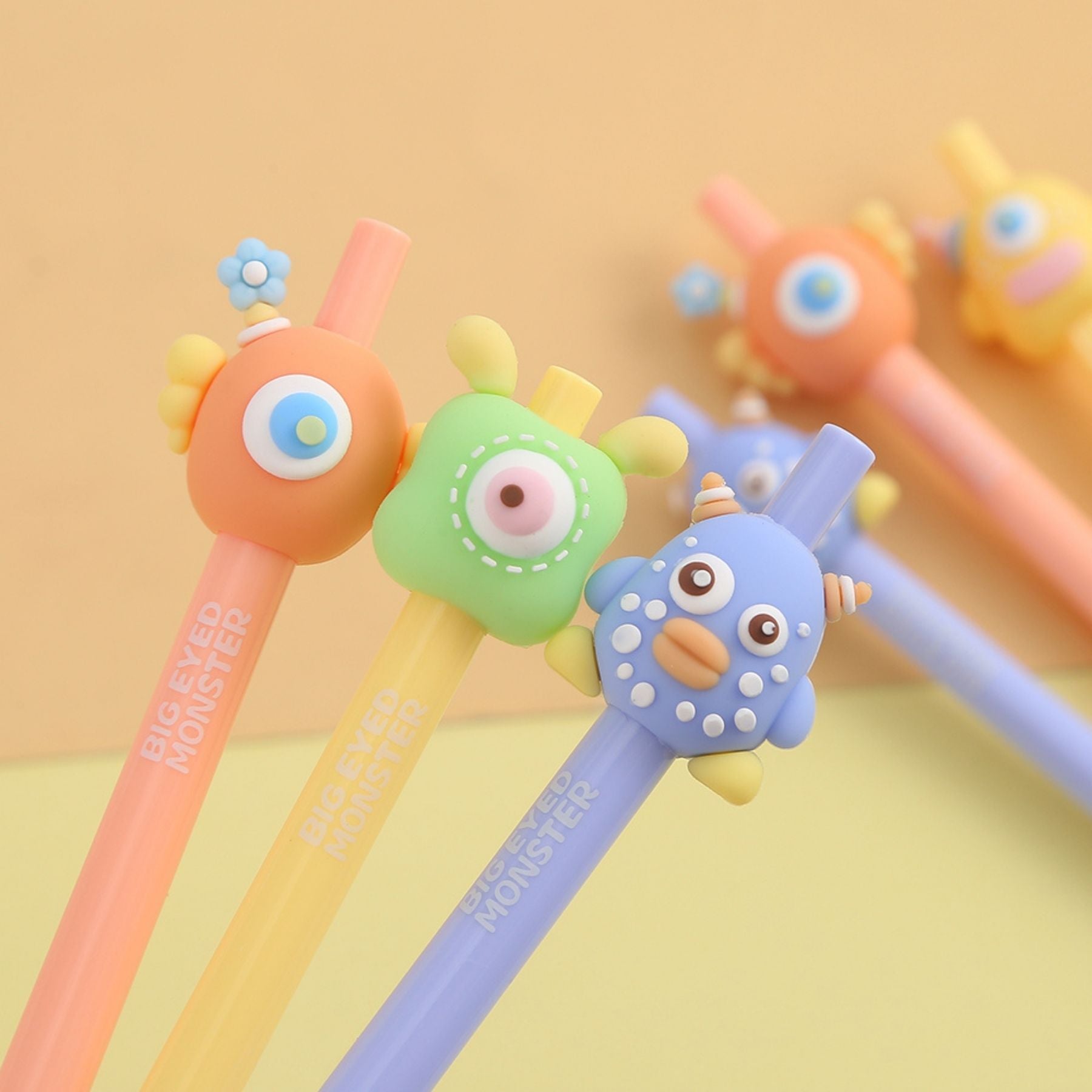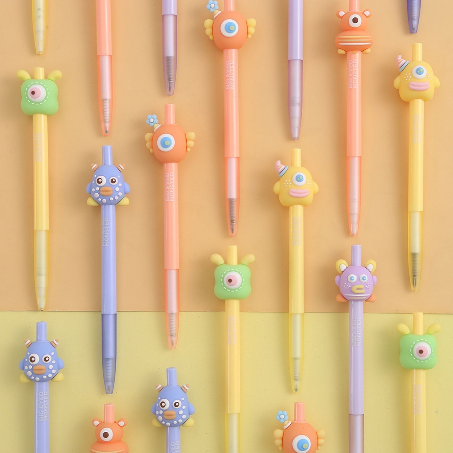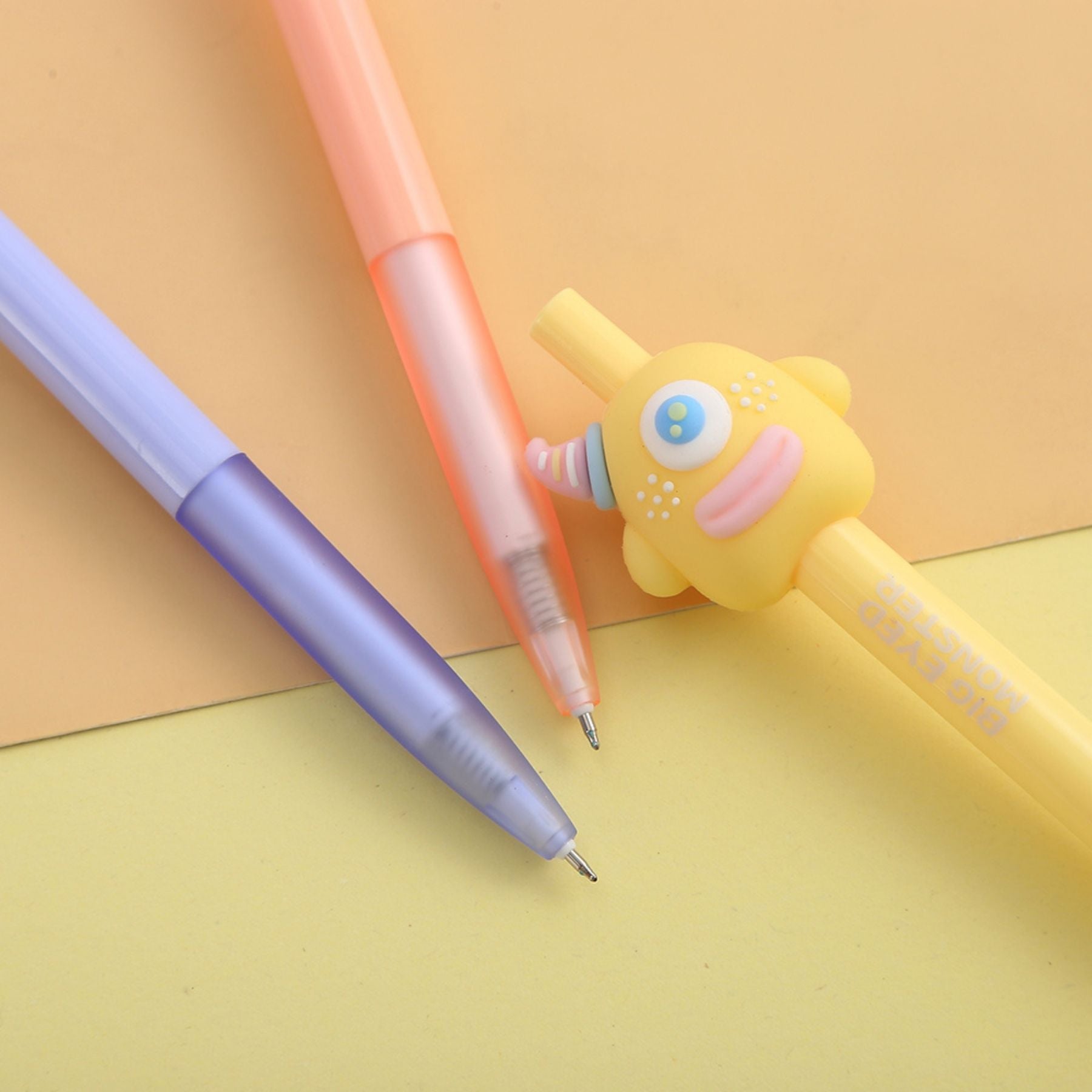 · The pen has a distinctive monster topper that features a unique sculpted rubber figure with oversized, prominent eyes.