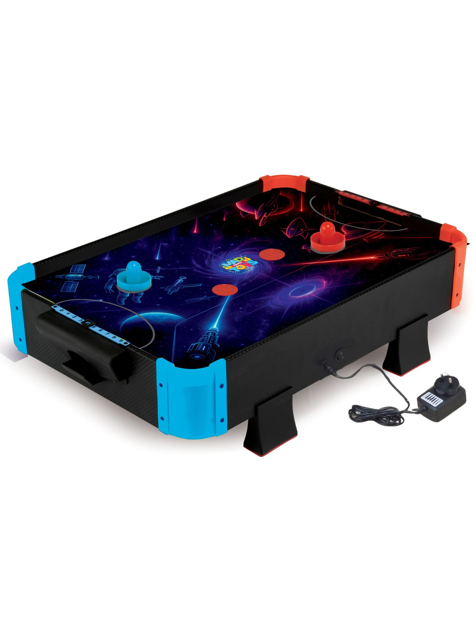 · This tabletop air hockey has a smooth surface for fast gameplay.